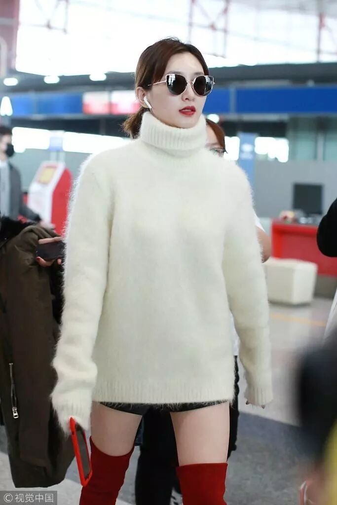 近日江疏影一身机场造型惊艳亮相,白色高领套头毛衣看起来干净温暖,红色丝绒长靴大气美艳,整体造型活力十足,有点仙气飘飘的感觉。