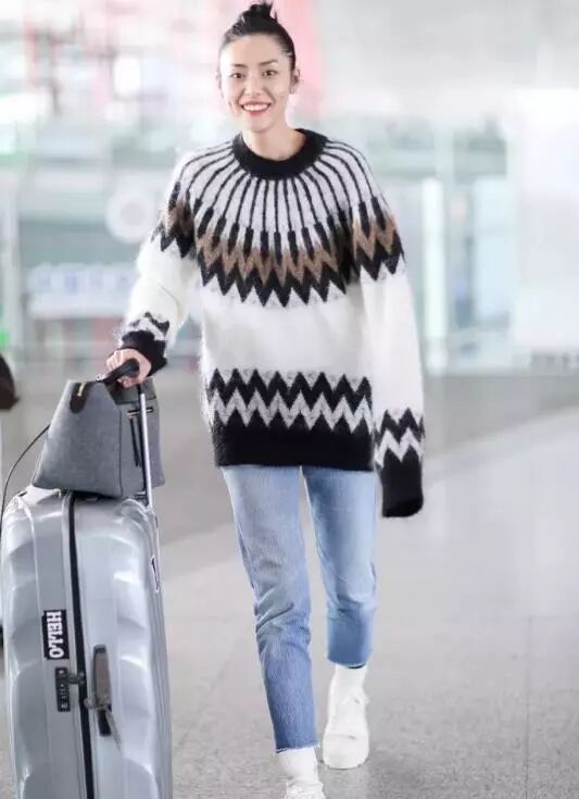 还有大表姐,她私下的造型大多休闲且接地气儿,还常常是平价品牌。这身复古毛衣搭配浅色牛仔裤、小白鞋,走起了青春学生范儿。