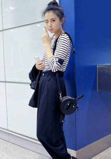 其实女神可不仅仅穿过这一款背带牛仔裤,之前的机场街拍中也有一张。