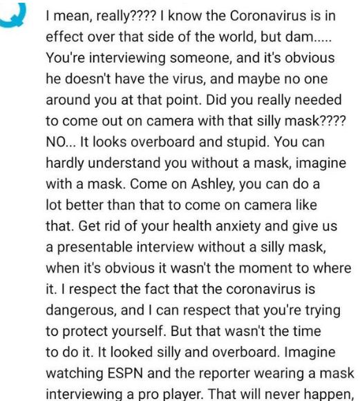 这位网友认为并不能因为病毒就戴上口罩采访,这样会对别人不尊重、对选手不尊重,这是一个十分愚蠢的采访,很明显这并不是很好的示范。可能这位网友是真的没有去我们国内感受一下吧,这次病毒的可怕程度并不是你想象得那样简单,戴上口罩了目的不仅仅是为了防止别人传播,也是为了保护选手。