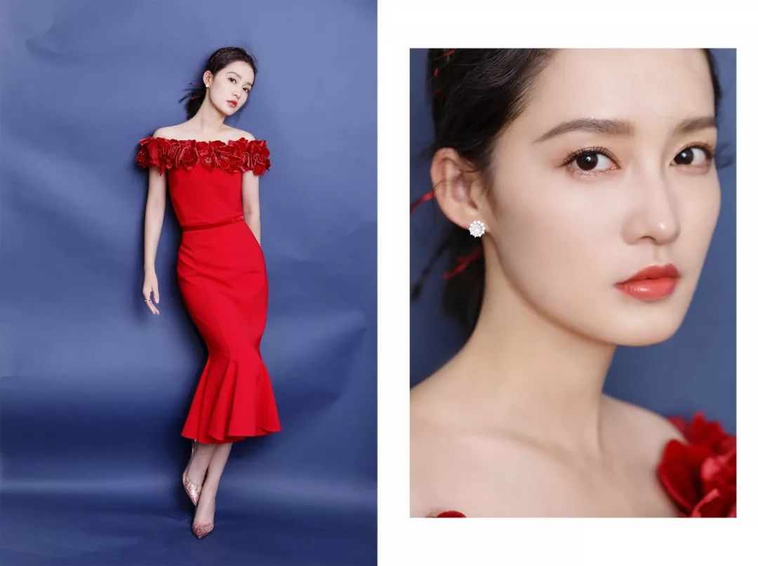 李沁选择了Marchesa一字肩裙很有女人味,肩膀褶皱远看就像红色的玫瑰花瓣,耳饰和戒指来自萧邦Chopard,透明闪闪材质的Christian Louboutin高跟鞋显腿更长!