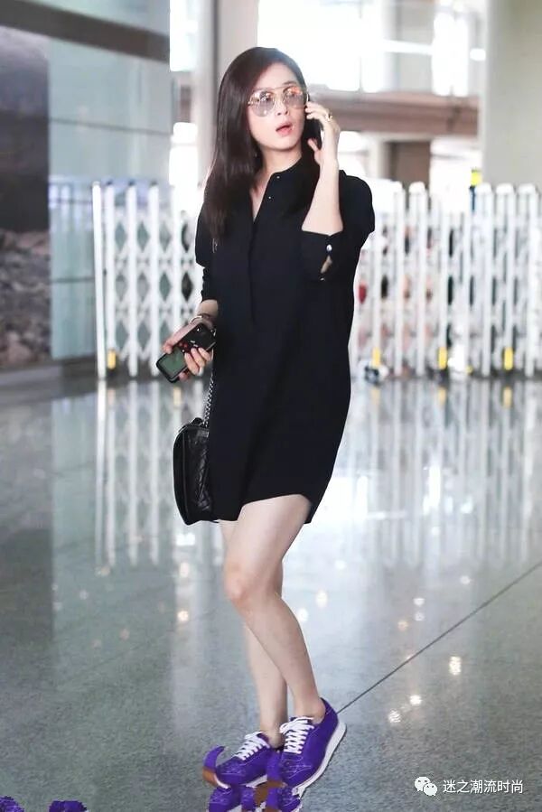 蒋欣黑色的衬衫裙搭配起来的风格非常的有水平,能够看得出来机场造型当中,如果想穿运动鞋,那搭配起深颜色的裙子是不错的。现在的墨镜都不再是简单的黑色啦,像这种颜色浅浅的,还带着亮光,看着就很时髦。