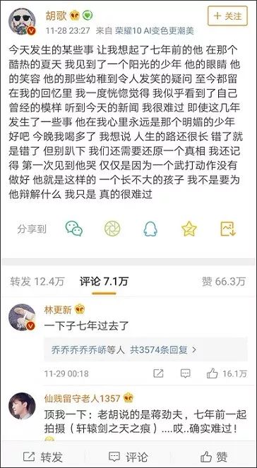 但是胡歌,成为了娱乐圈第一个发微博表态的人。