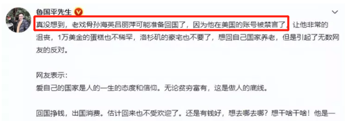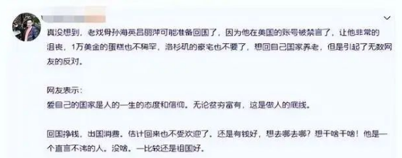也有网友表示:国外举目无亲国外定然是待不下去的,人老了容易念旧,不回来该这么办?果然,知名作家鲁国平也纰漏了两人回国原因,更坐实了两人遇到的困境。