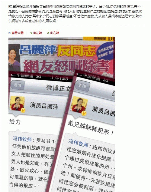 曾于2011年6月28日,她转发了“反同”言论,并赞同回应掀起了巨大的讨论热潮。吕丽萍用了“羞耻”、“罪人”等激烈的言词引发了轩然大波。