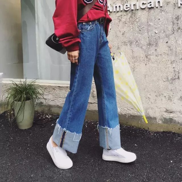 一条合格的阔腿牛仔裤,裤子的长度应该接近脚踝甚至更长,若是刚刚超过膝盖的话,只能祝你自求多福了。