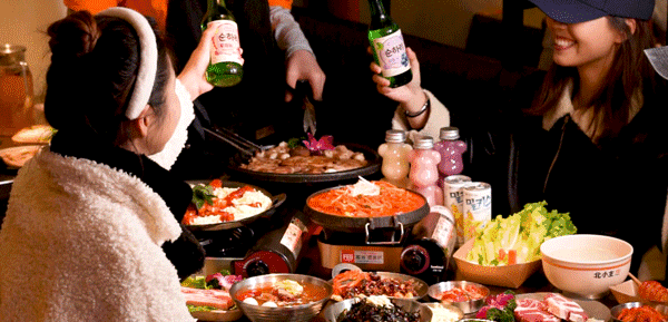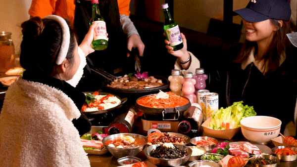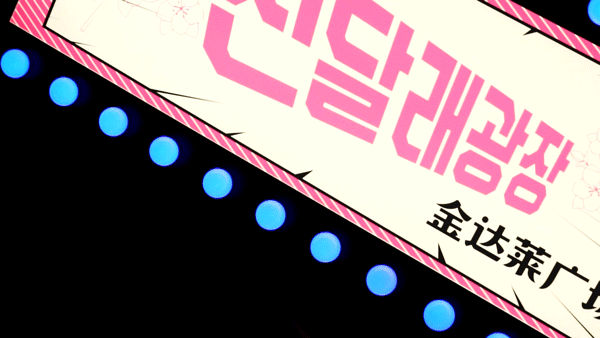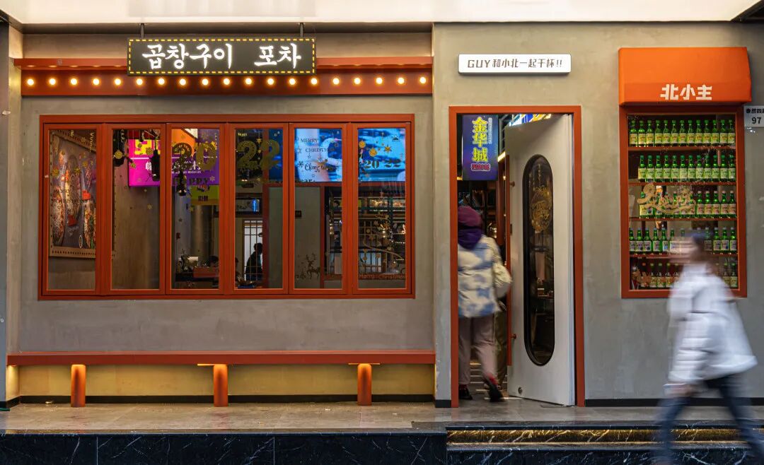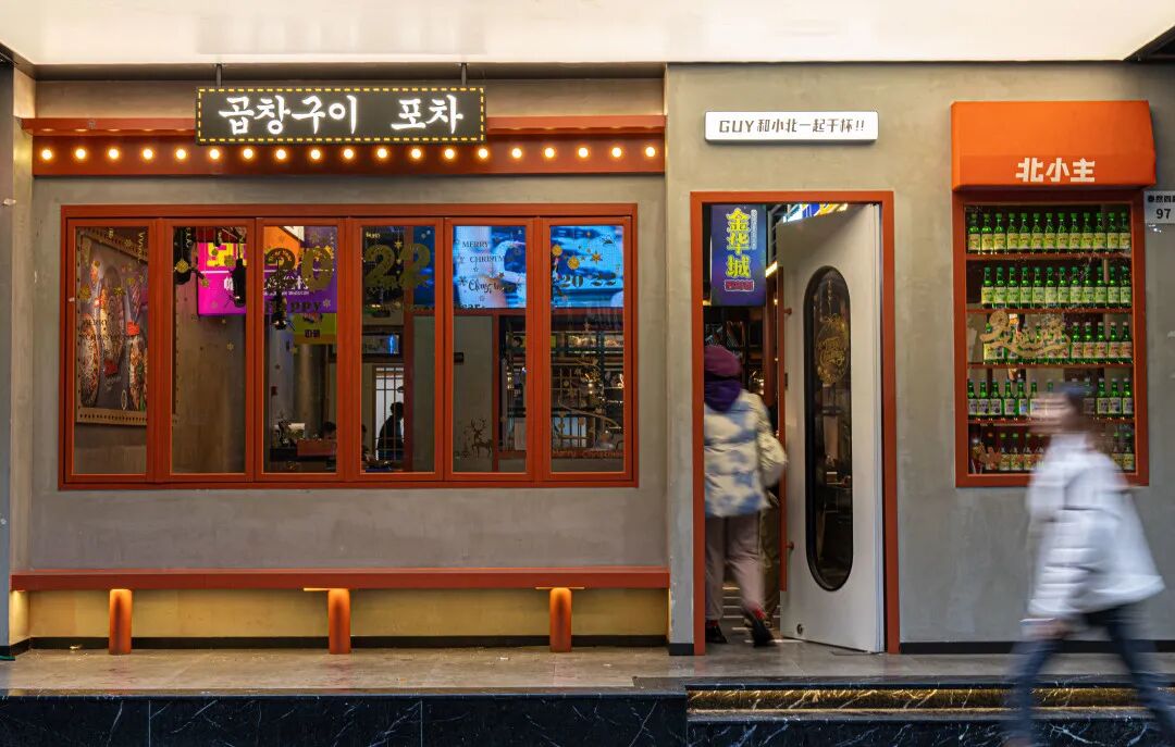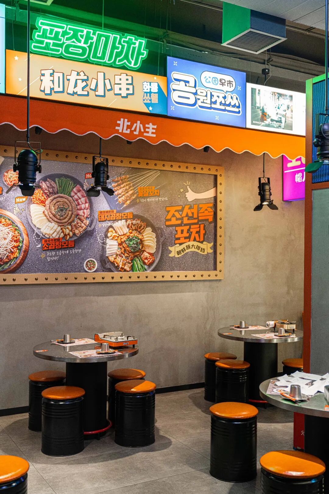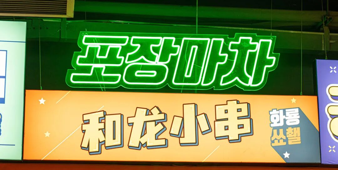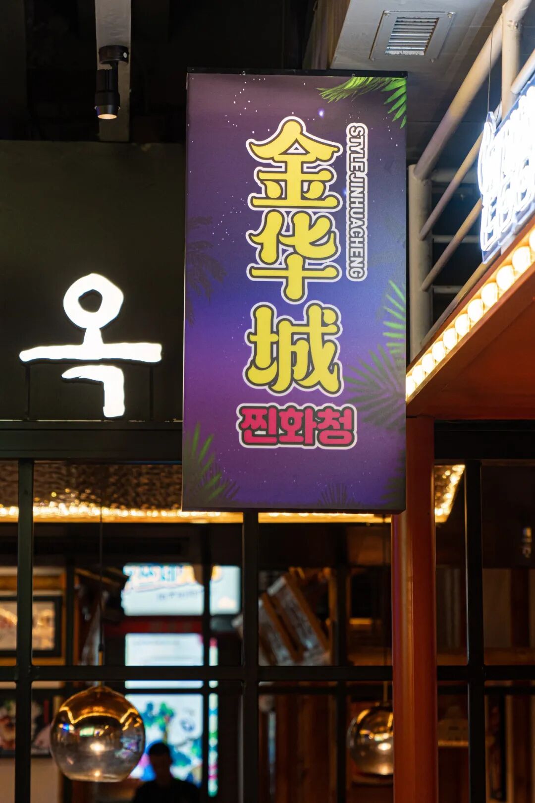 老板娘来自朝鲜族,并将店铺的风格装修成延边街头风情,大小霓虹灯的韩文、亮橙的配色点缀,电视里播放的女团舞,让店里的氛围一下子拉满!