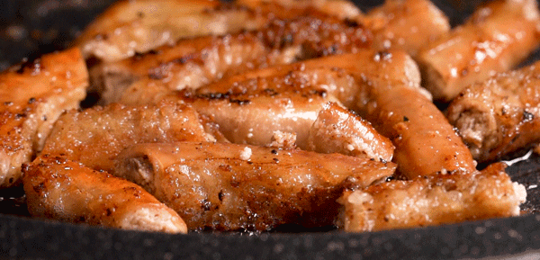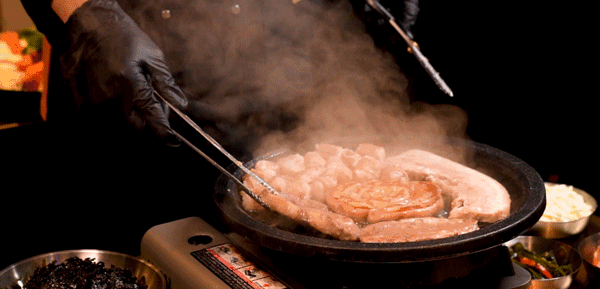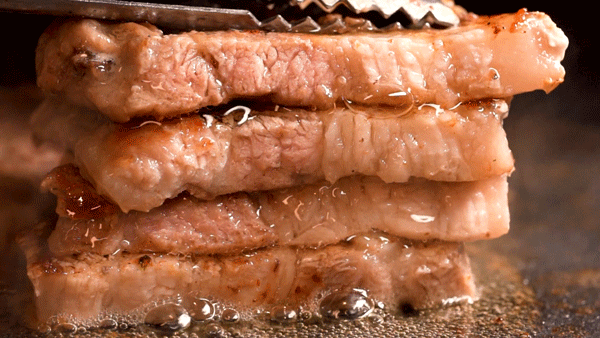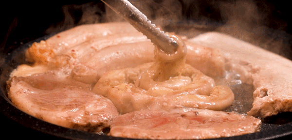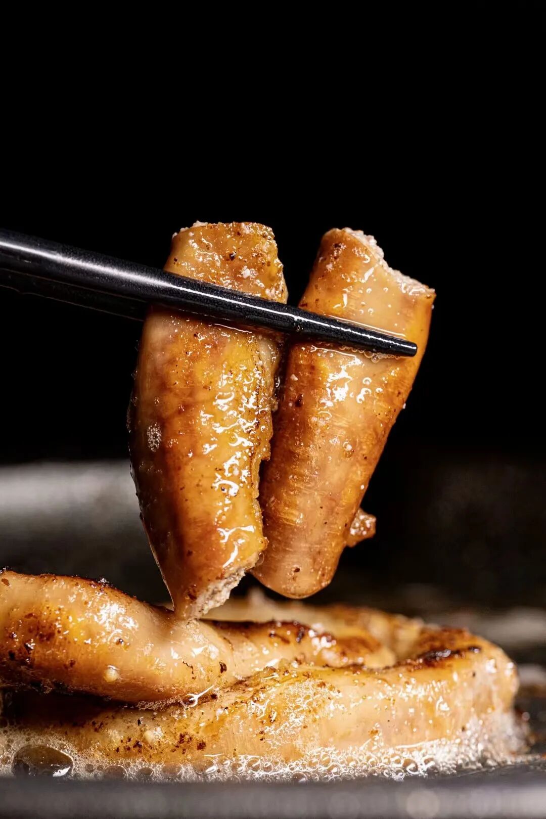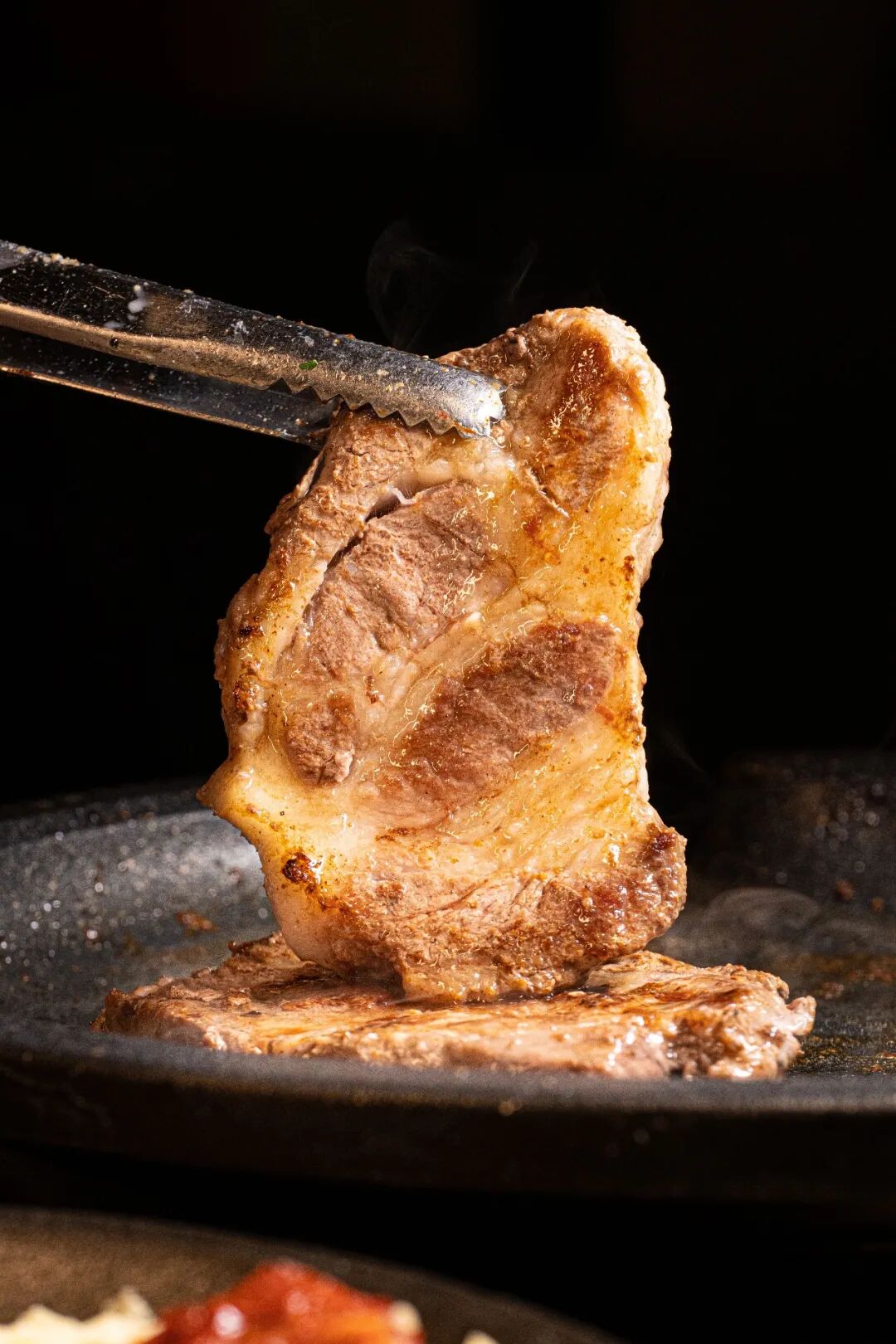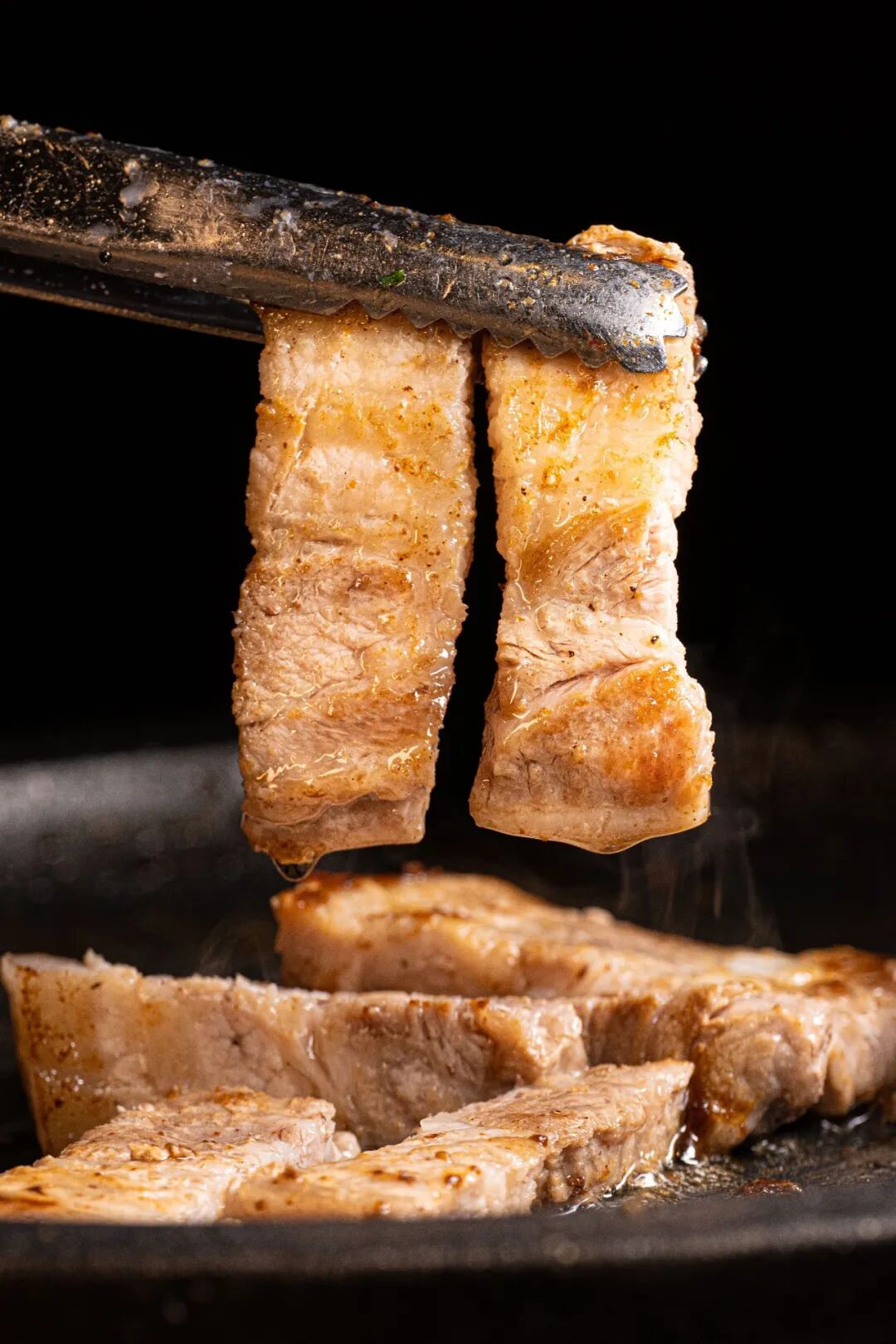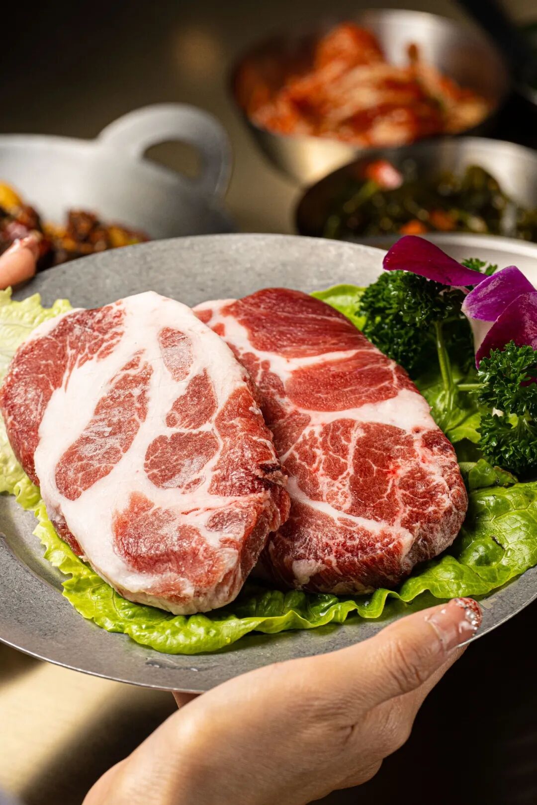 光是这厚度就能看出老板娘的诚意了,肉质肥廋相间,烤出的油脂够丰腴,厚度也很满足,看着梅花肉在烤盘上滋滋作响,心都被治愈了啦,一口吃下真香!