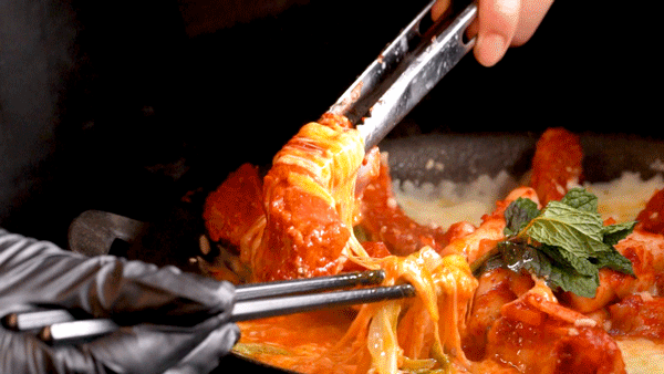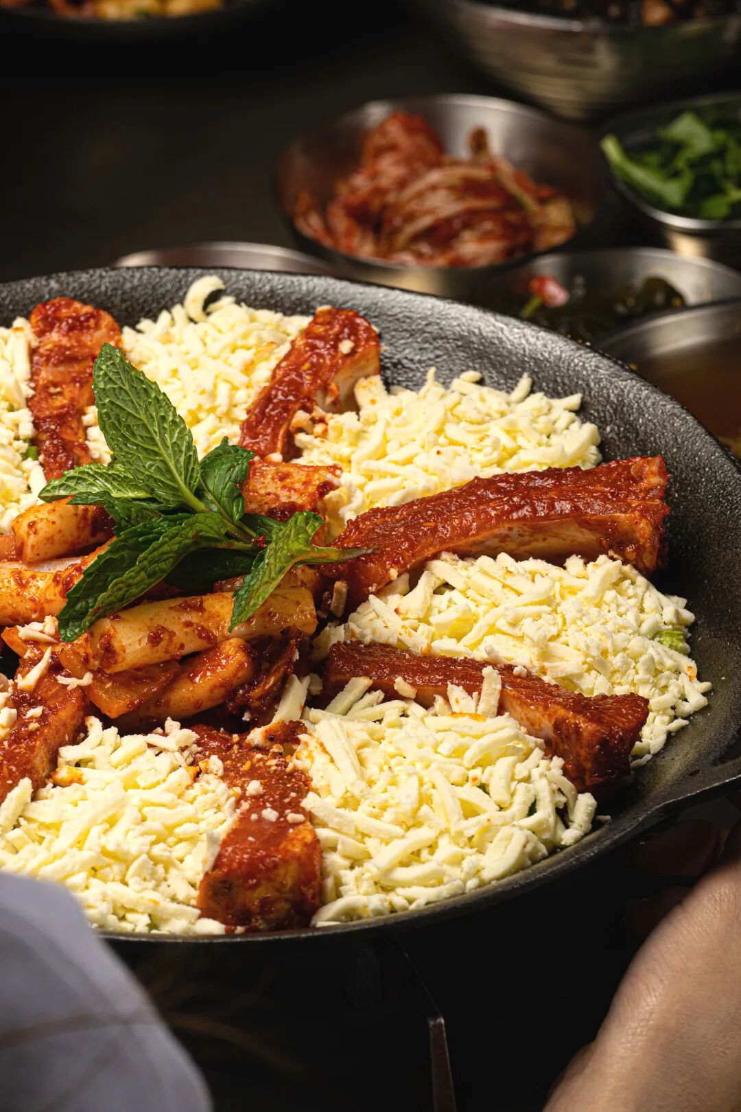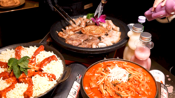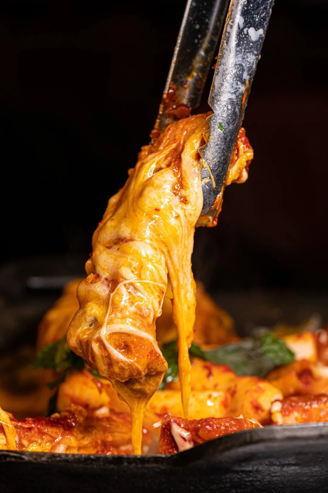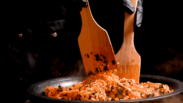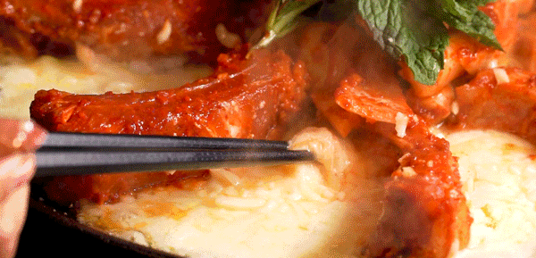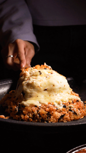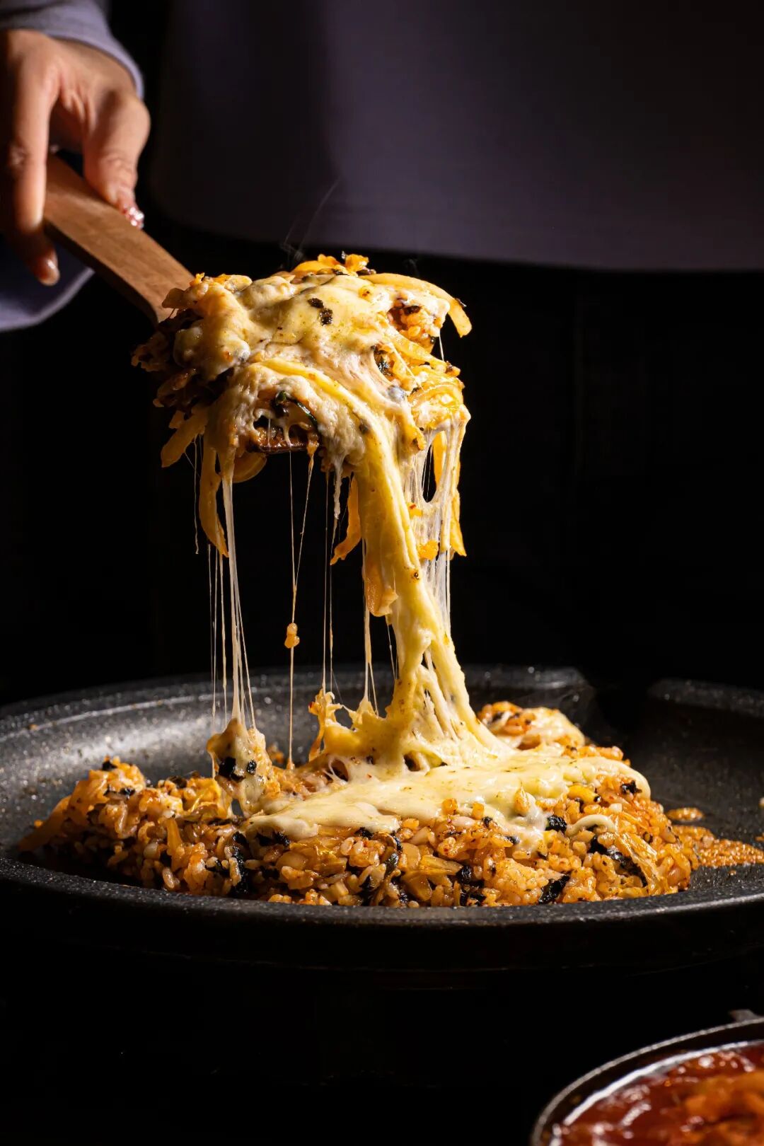 收尾记得来份芝士泡菜炒饭!就着烤盘上的牛油,加入海苔碎迅速翻炒,每粒米饭上都裹上了牛油香,最后倒入整碗芝士炙烧,一份灵魂芝士牛油泡菜炒完就出炉咯!