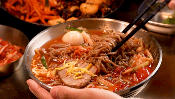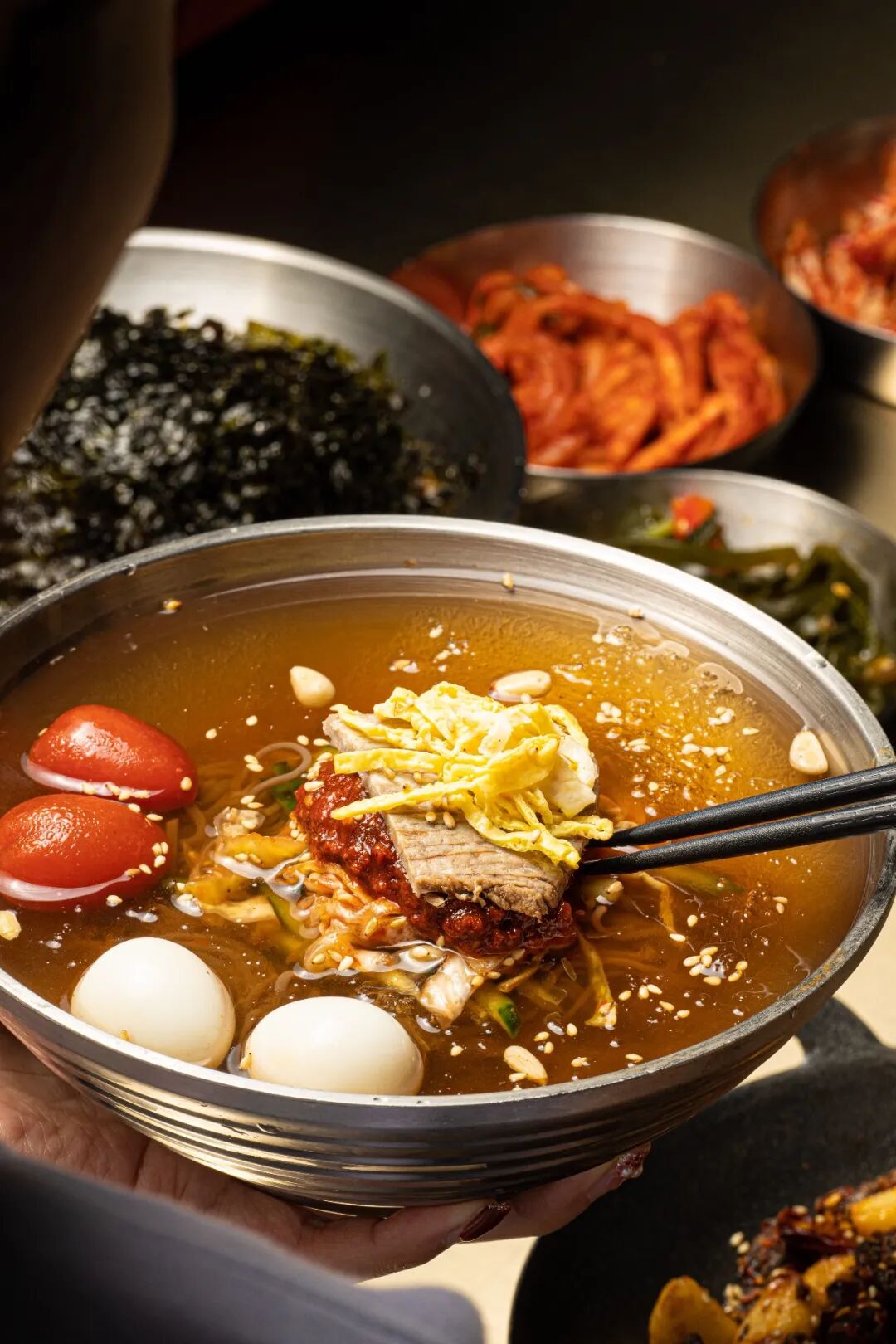对啦,吃烤肉必须来碗冰凉的延边冷面,用的是延边空运来的荞麦面,入口清爽又有嚼劲,搭配酸辣的汤底,还有牛肉片、黄瓜丝、溏心蛋的加持,嗦一大口很是过瘾!
