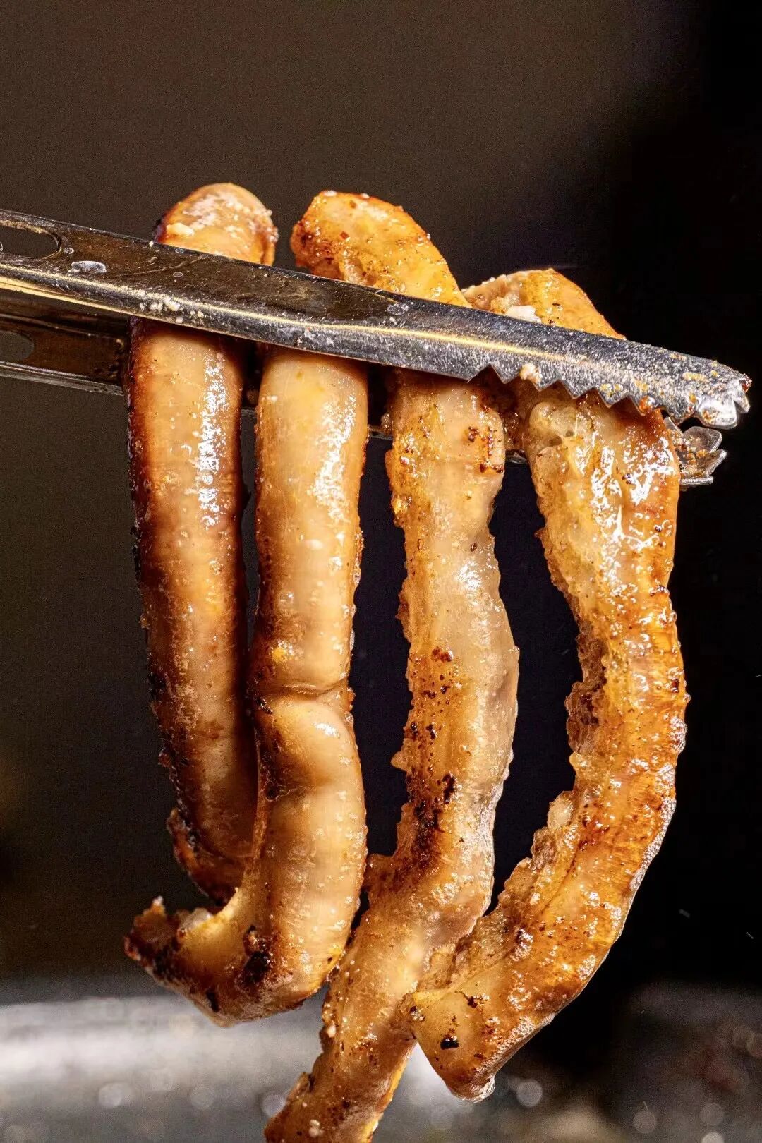 这烤的焦糖色的牛大肠谁能不爱?油脂完全被逼出,剩下的肠衣外皮焦脆,一口咬下,那股酥脆香糯的瞬间充斥整个口腔,一点也吃不出膻味!