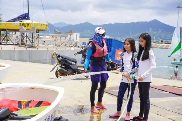 上午的练习结束后,小伙伴们一起帮助教练,拖船上岸,清洗船