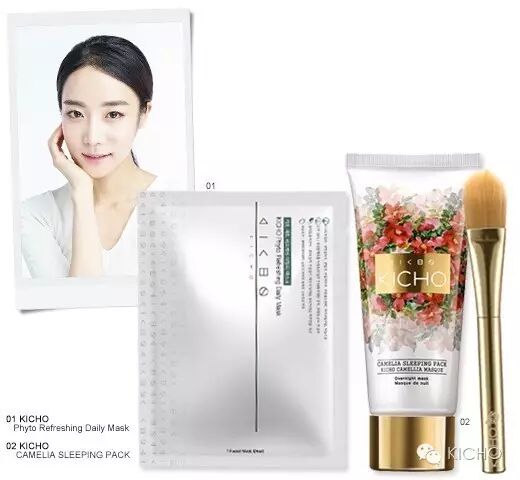 02 集纯山茶睡眠面膜(KICHO CAMELIA SLEEPING PACK)有效镇定肌肤、抗击老化,是含有保湿力出众的山茶油(山茶花)、红参、玫瑰水和羊毛脂(羊油)成分的睡眠面膜。产品富含营养成分,肌肤吸收力佳,可以在睡眠期间有效护肤。使用配套的面膜刷,可以大大提高面膜使用效果。