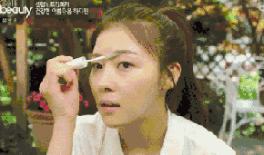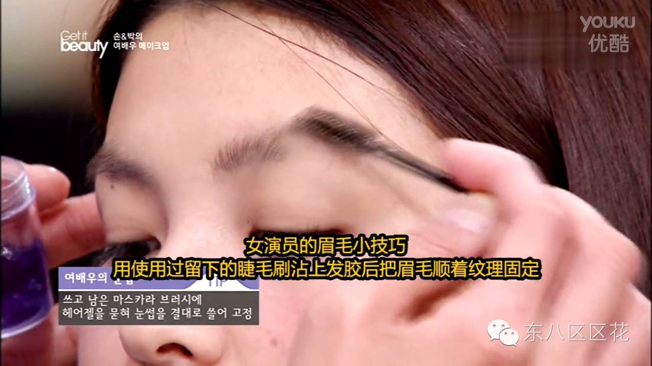 为了让眉毛看起来自然,眉头很重要,一定要让眉头的眉毛都竖起来,全智贤不用眉粉类的产品,而是用透明的睫毛膏或者用发胶固定眉毛。