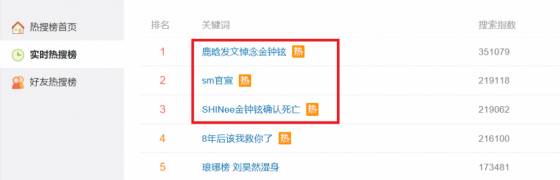 SHINee钟铉的死亡消息占据了微博热搜榜,鹿晗得知此消息也在微博上发文“不敢相信。一路走好,最好的主唱”。