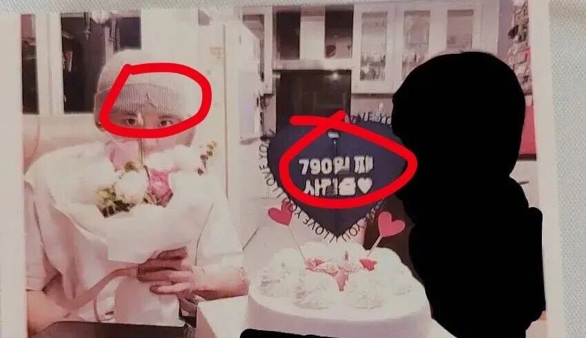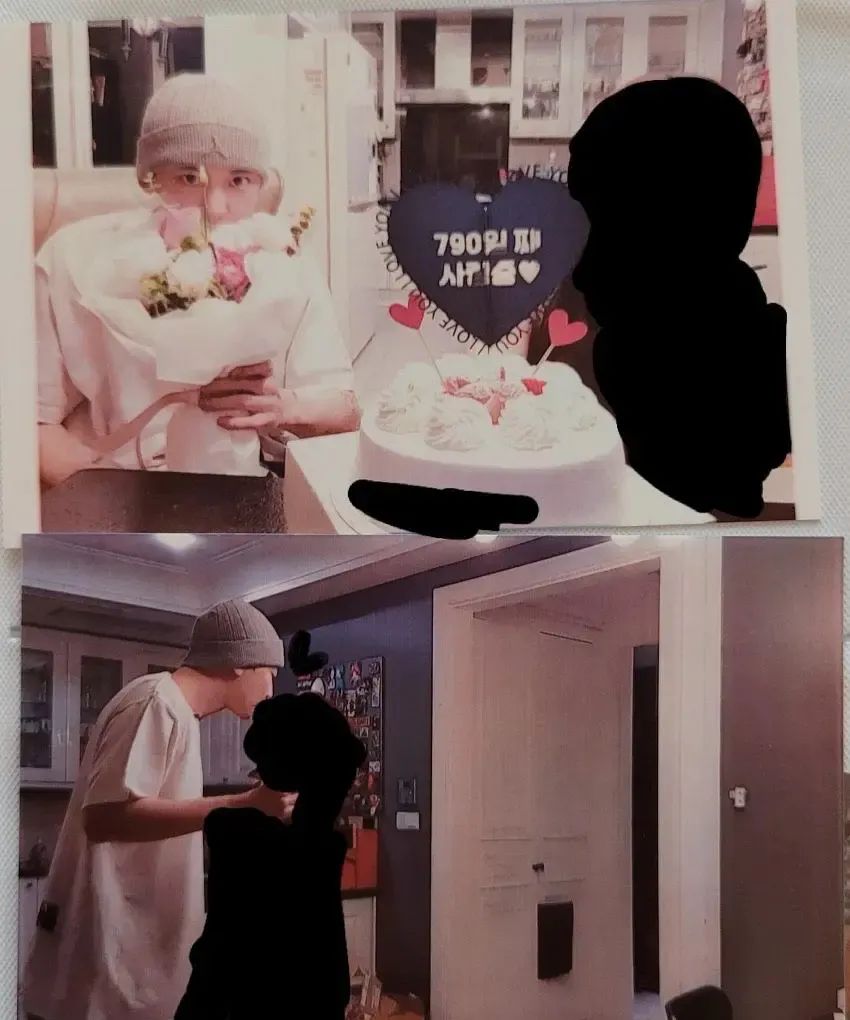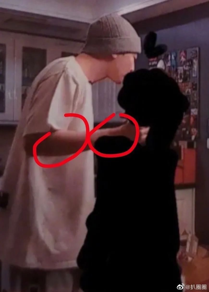 第四个疑点也是目前争议最大的亲吻照,两个人亲吻的姿势太奇怪了。朴灿烈的手不像是亲吻的状态,倒像是抓着什么东西。如果对面站在的是亲吻的人,那他的动作就像是掐着对方的脖子,实在说不通。被涂黑的部分,头部形状看起来也不像是人,而是一束花。