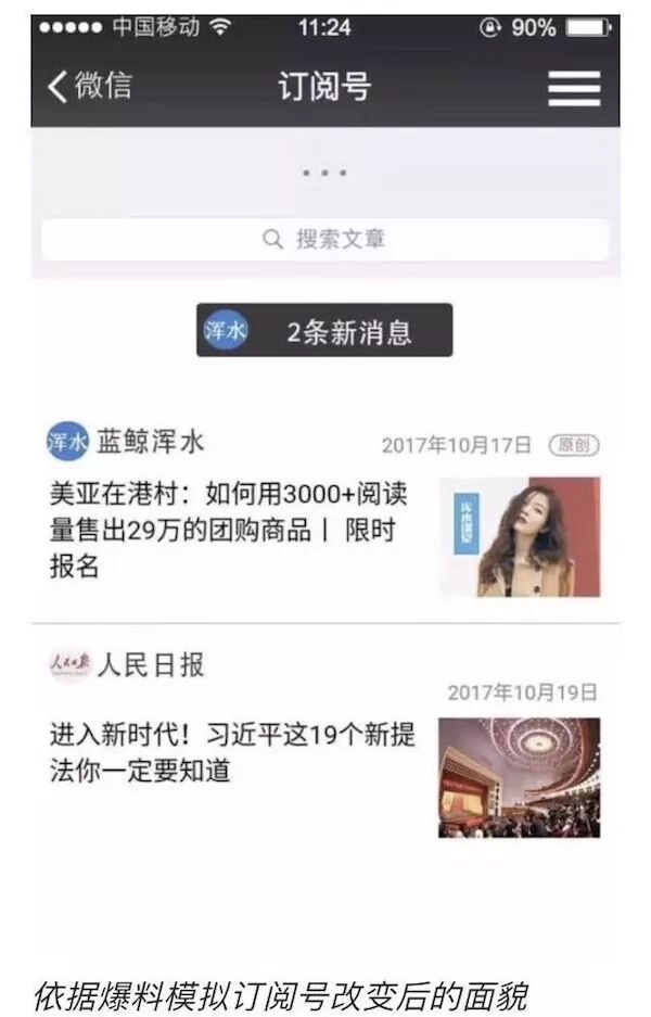 有爆料称:微信订阅号正在进行重大改造。关于作何变动,大致是点击订阅号直接可以看到不同账号发布的内容,无需再通过点击某一公众号查看推送信息,音频和视频也将有更直观的呈现方式。有圈里人预言“如果订阅号改成类似信息流的形式,粉丝的价值将大大降低!” 但微信不可能真想干掉自媒体,它只是想逼自己、逼大家探索更好的形式和体验,毕竟不打扰用户一向是微信的原则。