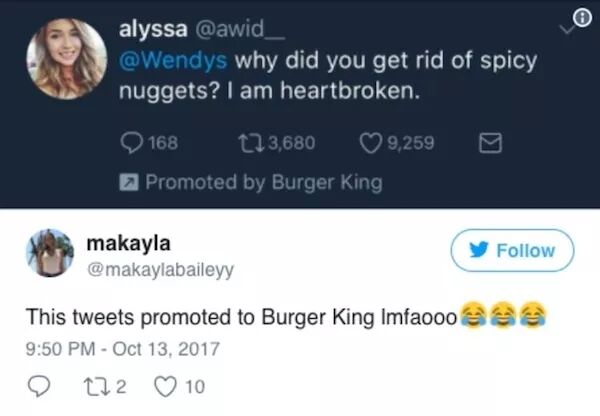 今年3月,Wendy's宣布取消其受欢迎的产品辣鸡块,一时间收到了许多粉丝们的请愿,要求其重新考虑。为宣传自家产品,汉堡王借题发挥,与网友共同“呼吁”Wendy's要听取消费者的意见。在一些请愿的Twitter中,细心的吃瓜群众发现汉堡王竟然“悄悄”为他们做了推广。刻意为之还是得意忘形?汉堡王还未对此事做出回应,不过这或多或少都让汉堡王从Wendy's那里抢到了点“风头”。