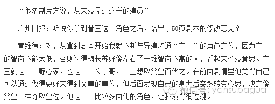 黄 维德:对,从拿到剧本开始我就不断与导演沟通“誉王”的角色定位,因为誉王的智商不能太低,否则衬得梅长苏好像左右了一堆智商不高的人,看起来也没意思。 誉王就是一个野心家,也是一个公子哥,一直想取父皇而代之。在前面剧情里他觉得自己可以通过做得更好来得到父皇的皇位,但后面发现自己的身世后突然转变心 思,决定像父皇一样夺取皇位。他是一个比较多面化的角色,让我演得很过瘾。(广州日报,2015-09-19)