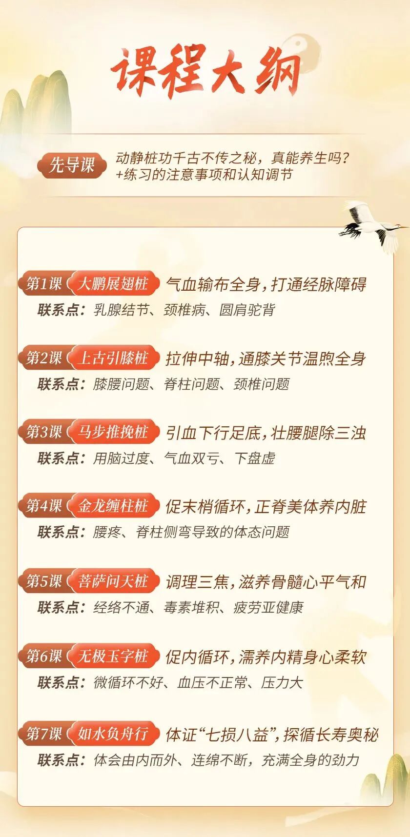 不需器械,随时随地练,不分年龄、不分性别; 7个动作,每天可完整练习,也可一个动作单独练; 能缓解疲劳,矫正肩背不良姿势,疗愈健体; 还从内到外调理五脏、疏通经络、调理气血、美容养颜……