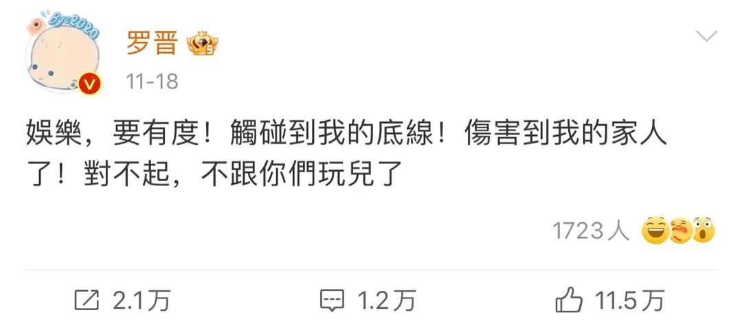“触碰到我的底线,伤害到我的家人!对不起,不跟你们玩儿了。”