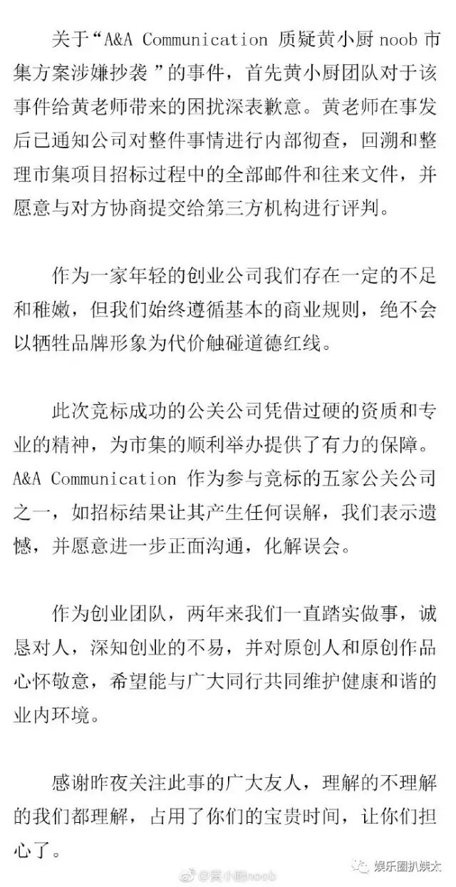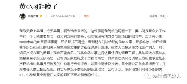 “如黄小厨涉及抄袭,黄小厨公司自会承担责任,并对责任人作出相应处理。”