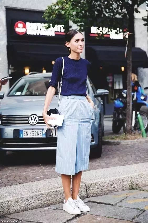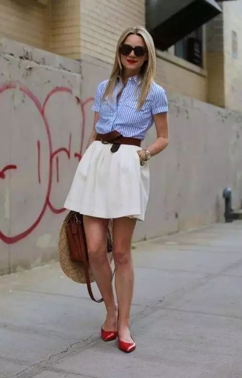 白色的休闲鞋搭配中长款条纹裙清爽干净
