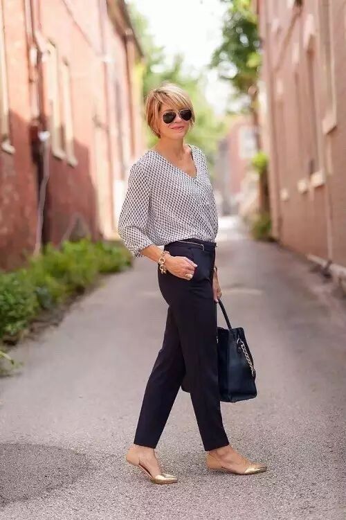 浅口的平底鞋在裤子上的搭配又多了一份优雅