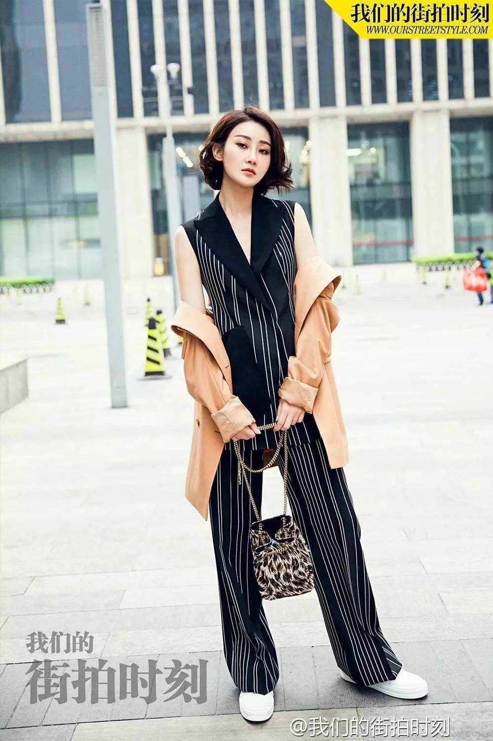 驼色西服外套、条纹无袖西服、阔腿裤搭配白色钻饰平底鞋。经典的条纹打造独特气质。