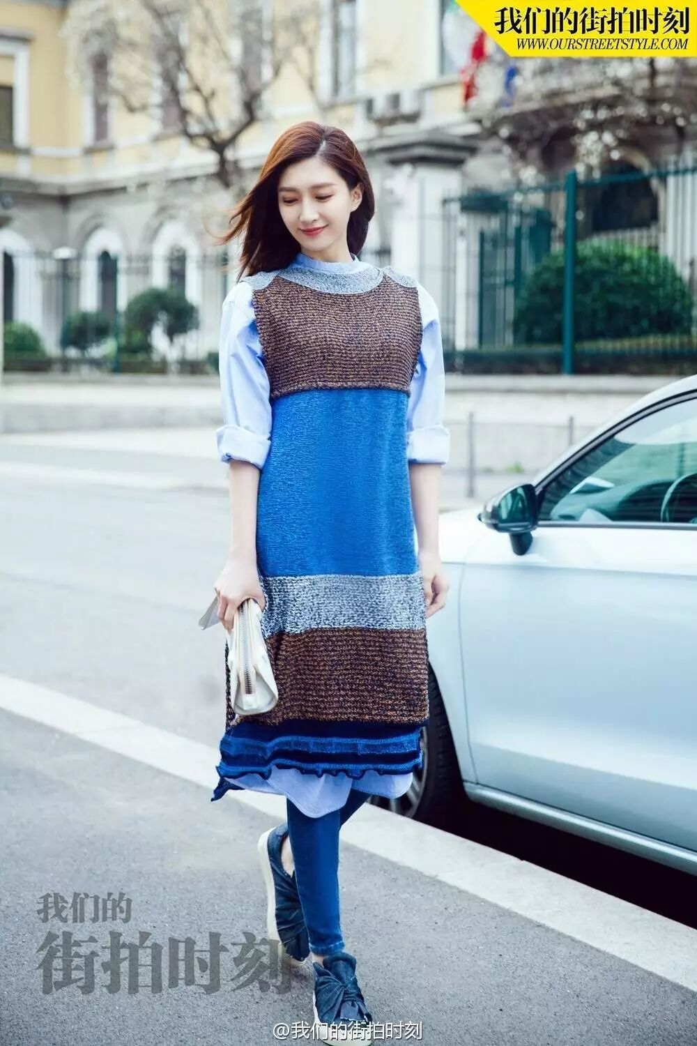 拼接长款无袖针织衫、蓝色长款衬衫、搭配蝴蝶结平底鞋优雅知性。
