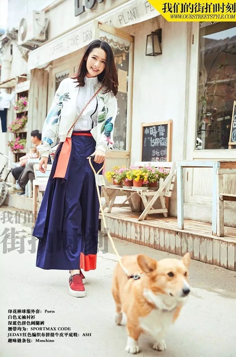 印花棒球服、深蓝色拼色阔腿裤搭配红色编织布拼接牛皮平底鞋,自在随意。好想有这样一个女友,我牵着她,她牵着狗。