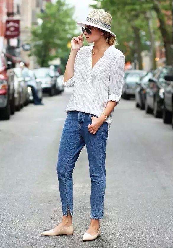 在裤子上搭配上,平底鞋更适合裤子。不过鞋跟与裤脚要留有一定间,会更显瘦腿长,而且很chic !