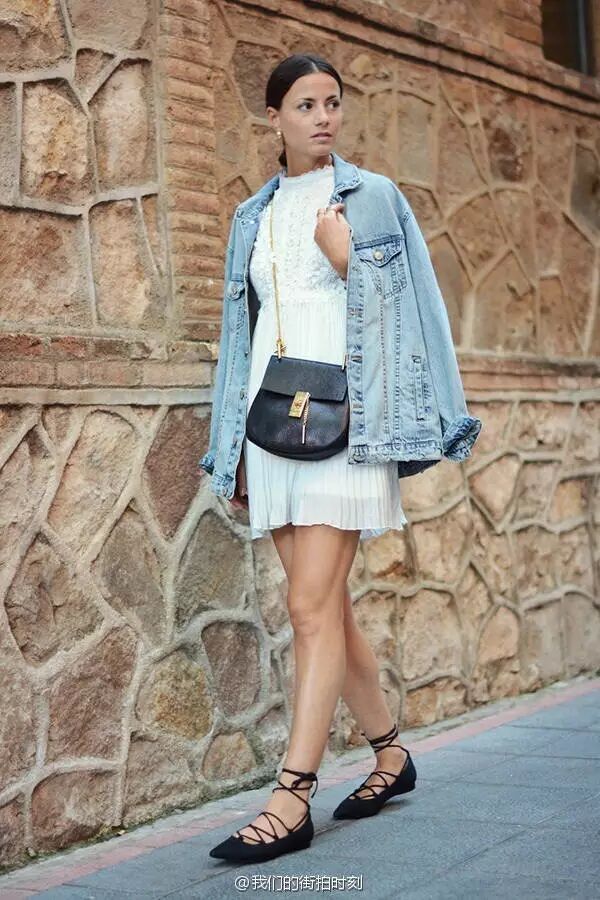 蓝色西服外套、白色镂空连衣裙搭配白色钻饰平底鞋,这样叠穿潮搭适合通勤外出。