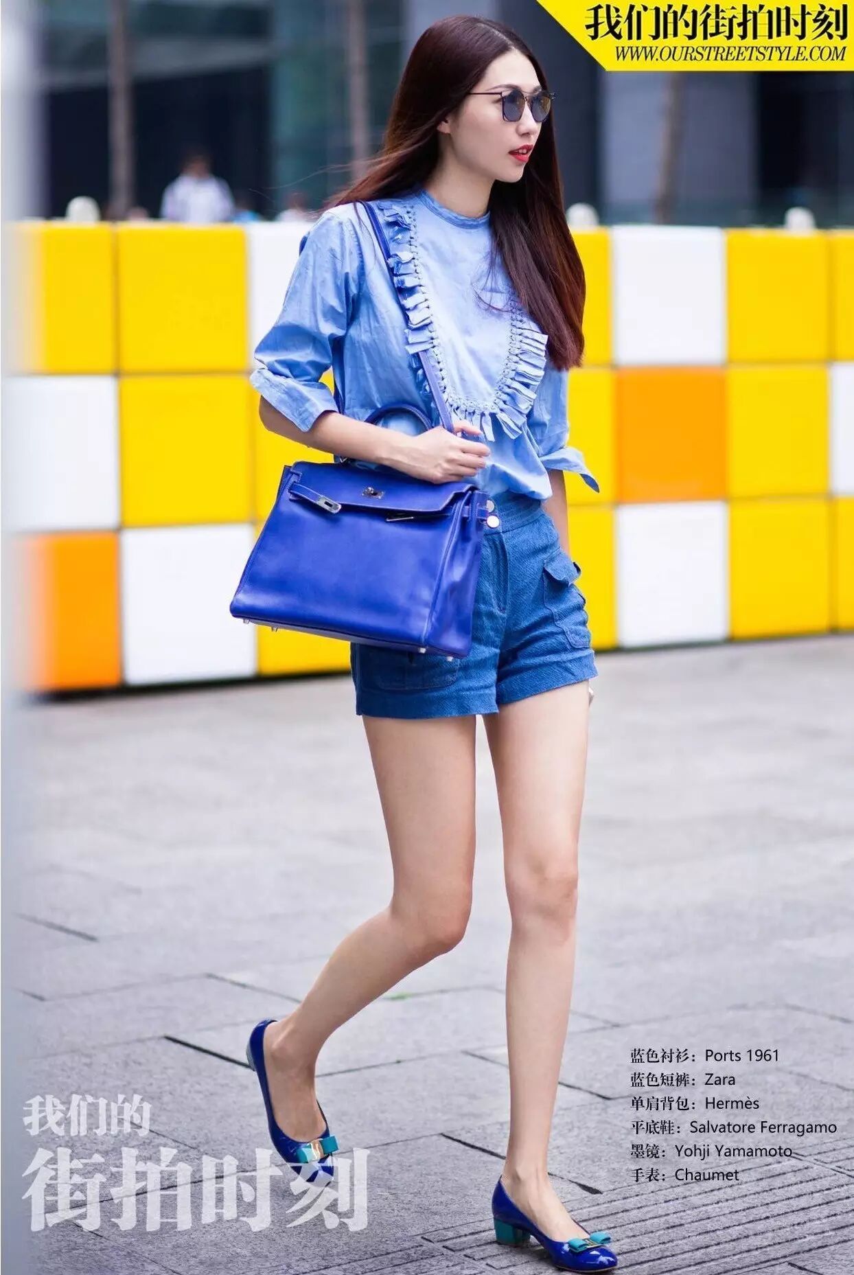 蓝色衬衫、蓝色短裤搭配蝴蝶结装饰蓝色平底鞋纯蓝色的穿搭给人一种马卡龙的视觉感,美。