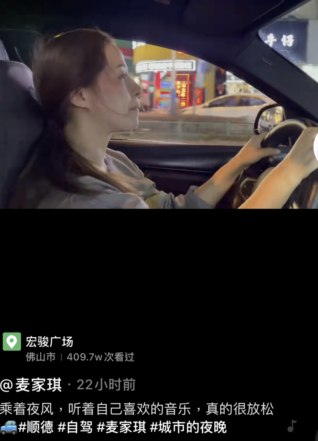 2018年对麦家琪来说应该是具有转折性的一年,这一年他全面复出了,不过只在香港参加了一个节目,之后就开始北上发展。如今,麦家琪已经落户广东。前不久她在个人平台上分享了一条展现个人驾车技术的视频,视频中麦家琪人透露在顺德,亲自自驾,在街上兜风,轻车熟路。