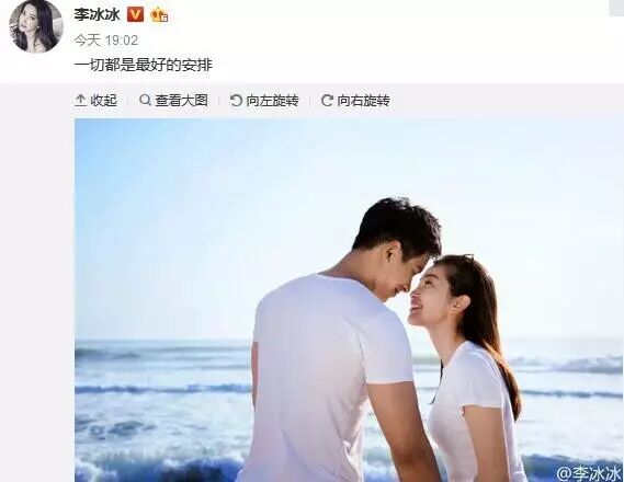 随后,李冰冰高调公布恋情:一切都是最好的安排。(妥妥地奔向结婚的节奏)