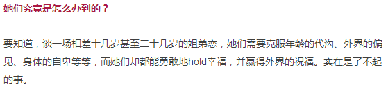 社会舆论对女性、对姐弟恋的宽容,与女性自身的努力和观念上的改变是分不开的,只有自己觉得大龄不是问题,有孩子也不是障碍,并努力成为更优秀更有内涵的熟女,才能配得上超越年龄障碍的爱情。
