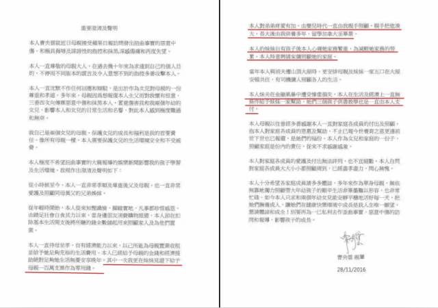 之后更是一纸声明,细说多年来对妈妈,还有对同父异母的弟弟、妹妹的照顾,希望妈妈不要再为了一已之私来伤害她。