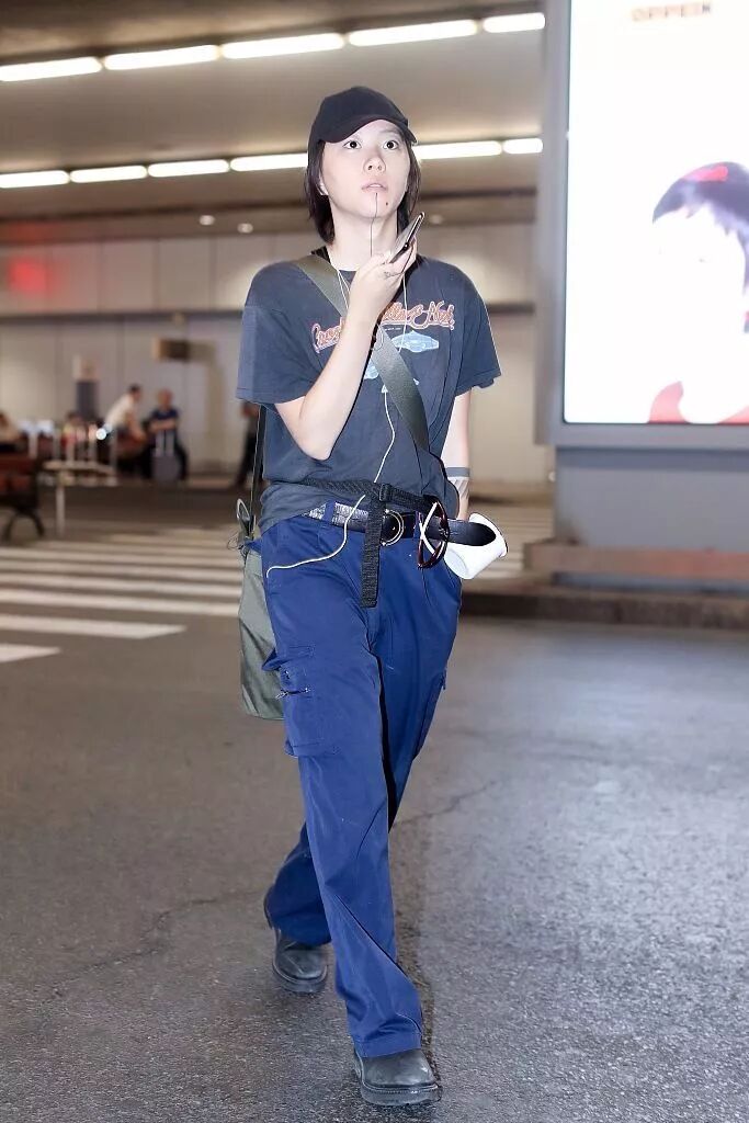 窦靖童头上戴着一顶黑帽子,现在很多人出去的时候都戴着帽子,觉得这件衣服比较平易近人,但她下面穿的是一条蓝色的裤子,这种蓝色的衣服在她身上可能会觉得更土!