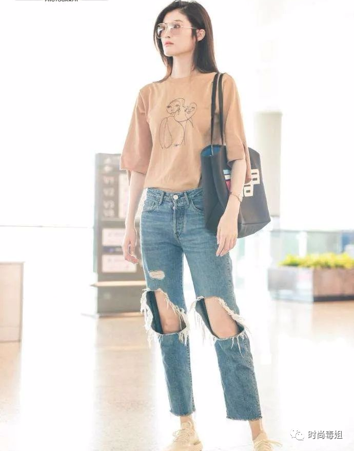 当然,何穗同样也是十分接地气的服饰,比方说这一身,上身穿着T恤,下搭一款破洞裤,脚踩运动鞋,简洁又朴素,配上挎着的帆布袋,百搭又实用。