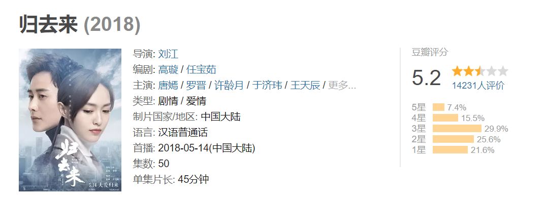 今年还有一部上面提到的靠着恋情大火的剧——《归去来》,虽然豆瓣评分5.2。