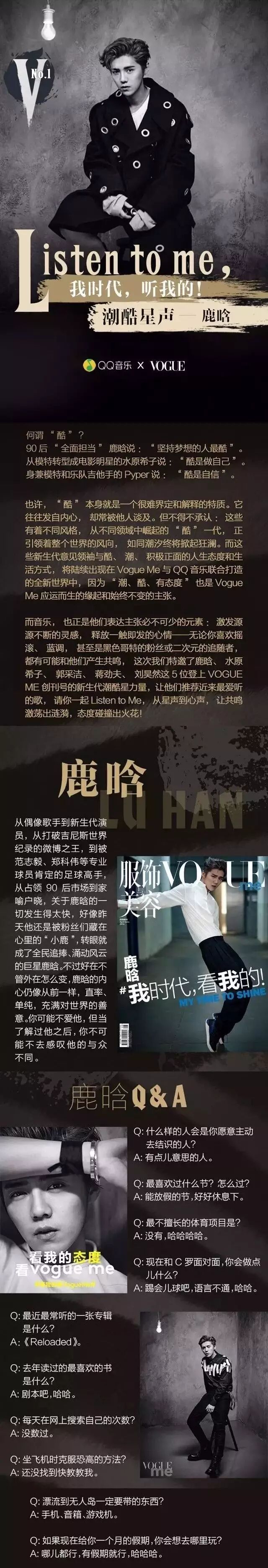 “酷”是一种态度,是一种引领世界风向的时尚主张,鹿晗、水原希子、郭采洁、蒋劲夫和刘昊然这五位从不同领域崛起的“酷”一代正是新生代的潮酷新力量,来听听他们近来最爱听的歌,请你一起Listen to me!