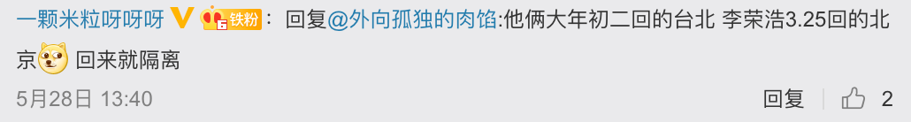 李荣浩在大陆工作,杨丞琳常居台湾。有网友算过李荣浩的行程,大年初二和杨丞琳回了趟台北,3月底自己回北京,回来就隔离。