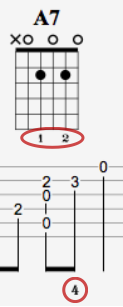 ☑ 和弦图以及时值符号下方的数字,都代表左手指法。