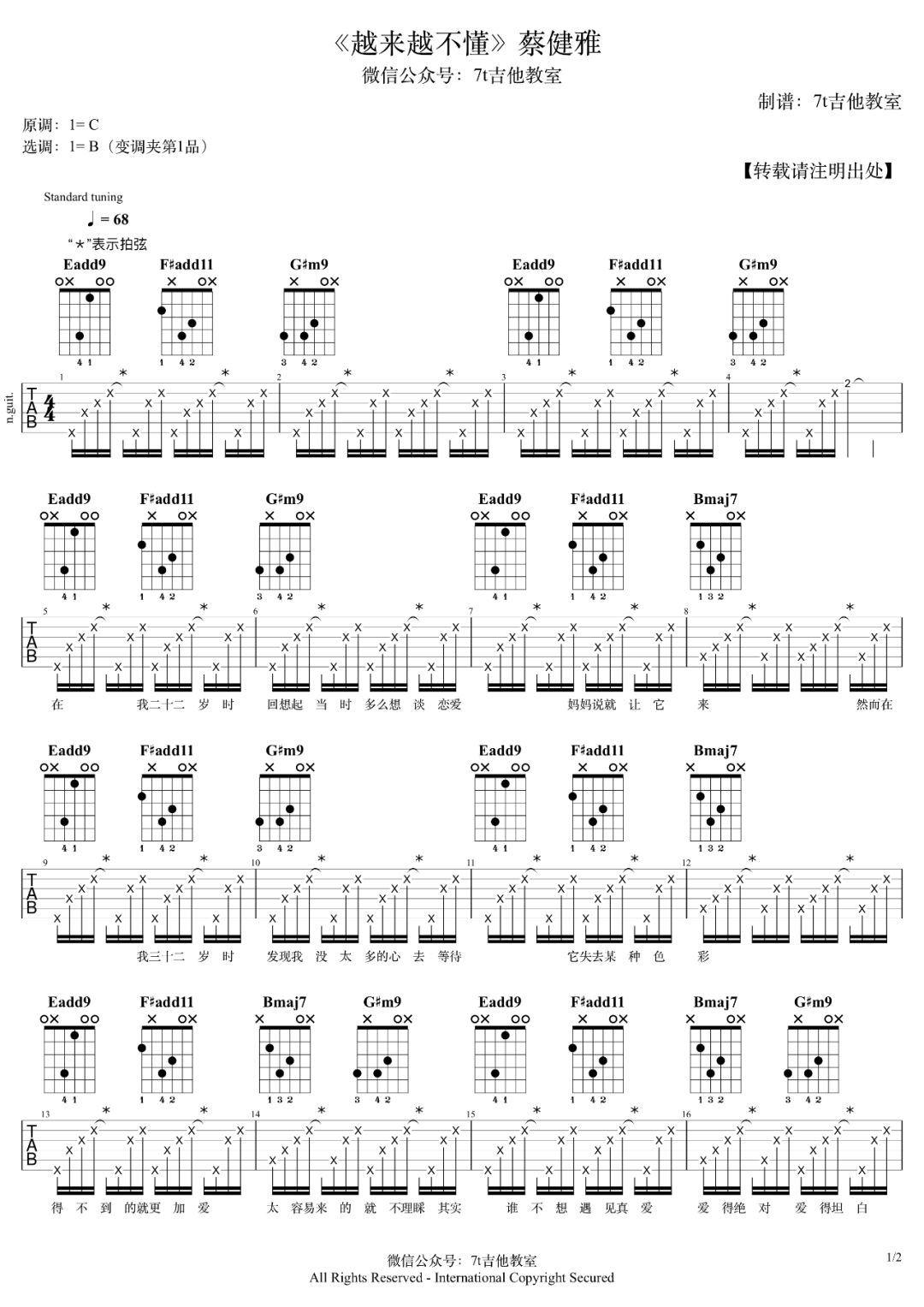 这首歌的原调是C大调,我用的是B大调的指法来编配,蔡健雅现场版自己弹的也是用B大调指法。使用变调夹,夹在第1品,弹出来就是原调了哦~
