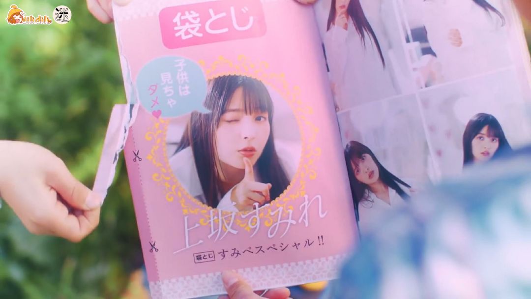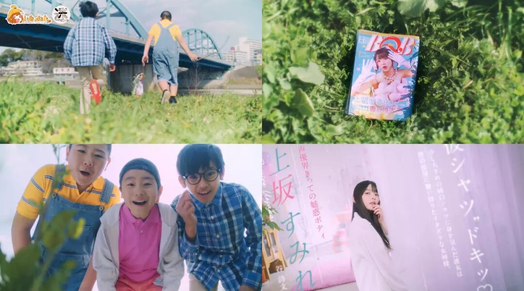 画面首先是几个小男孩在河川边玩耍,突然其中一个发现了“ 好东西 ”,叫了其他人一起过来欣赏。这怎么像是标准老梗捡到小黄书的剧情呢???当然,书的内容就是我们政委了。同时书上明写着“ 声优界的诱人身材——上坂堇 ”。所以政委对于自己的身材被圈内“ 如何看待 ”这件事上已经欣然接受了吗?