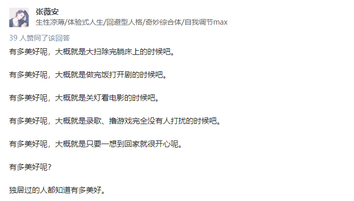 在知乎上,有一个问题是:你们的独居生活有多美好?