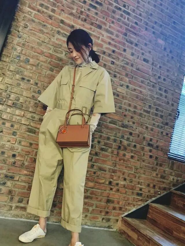 梅婷的这件工装连体衣造型感十足,草绿色充满生机与活力,搭配棕色包包,简单又有气质。