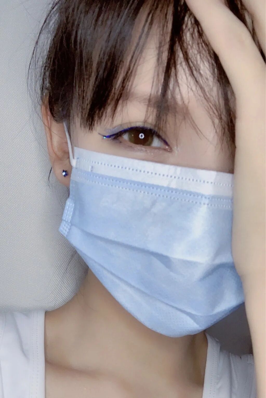 张予曦:更注重颜色。因为口罩是蓝色,所以我用了深蓝色的眼线,然后眼线的斜上方呢,就是画了一个银色的就这个小星星,然后另外一边是用一个浅蓝色的眼影,然后做了上面的晕染,就主要是跟口罩的这个颜色搭配。