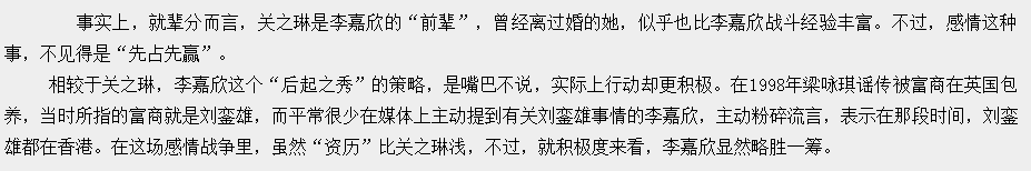 但嫁入豪门的过程无疑就是一个升级打怪的过程,李嘉欣之前交往的刘銮雄身边的女人有关之琳、蔡少芬、洪欣等,而许晋亨的前任也有何超琼刘嘉玲,甚至,流传的李嘉欣与关之琳较劲的八卦至今还在流传。